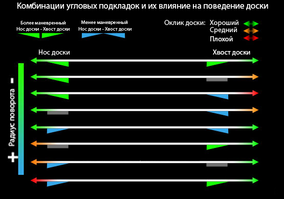 Угловые проставки (как на фото выше) обычно используются только на лонгбордах или круизерах, поскольку они не подходят для уличного катания, скейтпарка или рампы. Угловые проставки имеют форму клина, поднимая и устанавливая ваши подвески под фиксированным углом. Используя их, можно наклонить подвески к центру доски или же наоборот, в сторону тейла и носа. Если у вас есть лонгборд или круизер, то можно приобрести несколько угловых проставок и поэкспериментировать с различными комбинациями углов наклона подвесок.