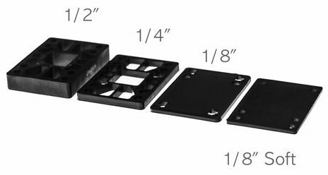 На самом деле всё просто. Речь идет об использовании проставок - райзеров (от англ. risers). Проставки устанавливаются между подвеской и доской, поднимая их на высоту от 1/8 дюйма до 1/2 дюйма. Использование райзеров - это единственный способ кататься с мягкими бушингами или большими колесами, не получая при этом ужасного закусывания колес.