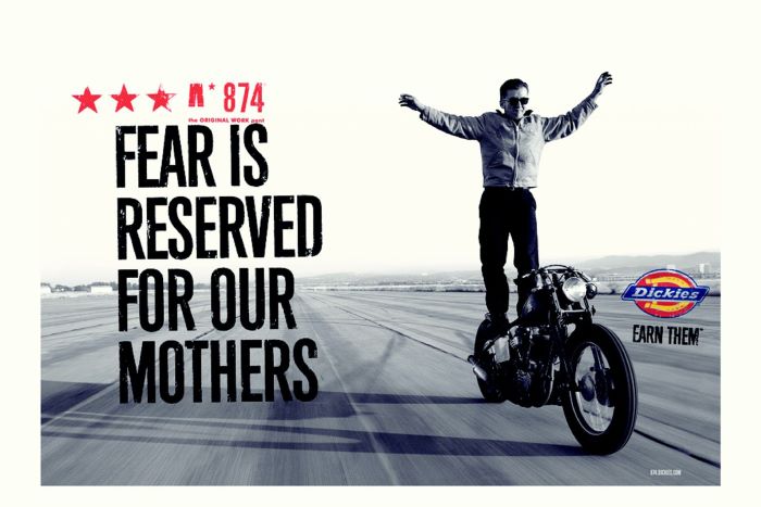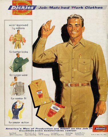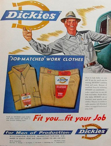 Пожалуй, историю появления брюк Dickies 874 стоит начать с положения бренда в 1960-е годы. К тому времени он давно зарекомендовал себя в качестве производителя износостойкой одежды. Важным толчком для этого были заказы на пошив формы для американских солдат в годы Второй мировой войны. Тогда компания изготовила порядка 9 миллионов комплектов униформы, что позволило обзавестись огромной инфраструктурой. К началу 1950-х Dickies начали шить гражданскую и рабочую одежду. Гигантские мощности, обширное производство и богатый опыт пошива качественной одежды миллионными тиражами — всё это позволило Dickies добиться беспрецедентного роста, обогнать всех конкурентов и стать американским брендом № 1 по производству спецодежды.
