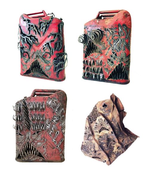 Он создаёт металлические маски, инсталляции, скульптуры из железных канистр и мусорных баков, разрезает болгаркой фургоны, монтирует видео и многое другое.