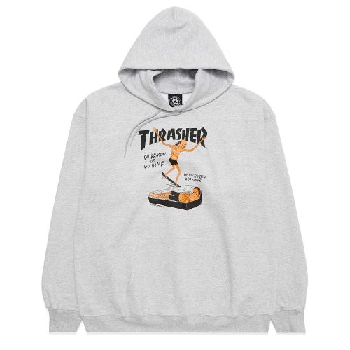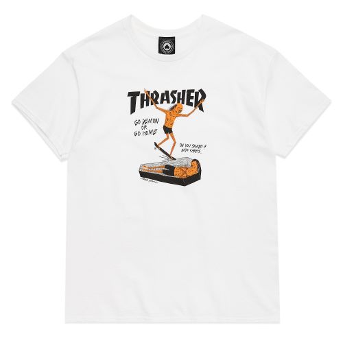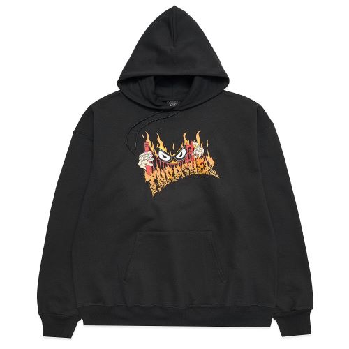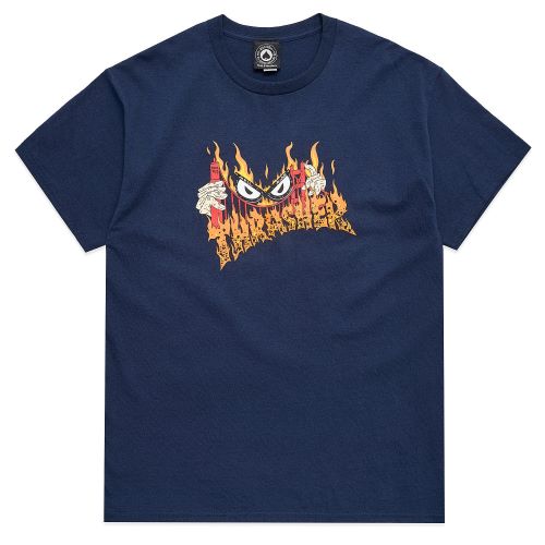 В этом принте художник эффектно обыграл классический логотип Thrasher, добавив к нему горящий мост, кучу огня и злые глаза.