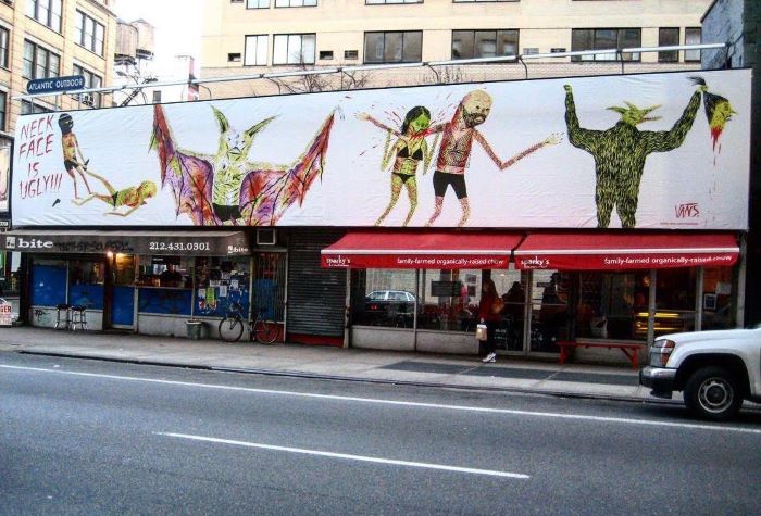 С Vans, кстати, связан один забавный случай. По легенде, NECKFACE был согласен работать с обувной компанией только в случае соблюдения двух важных условий: ему выпишут кучу денег и разрешат повесить гигантскую работу в самом центре Нью-Йорка. Так и произошло: на улице Лафайет в Даунтауне появился огромный скандальный биллборд с обилием уродливых персонажей художника.