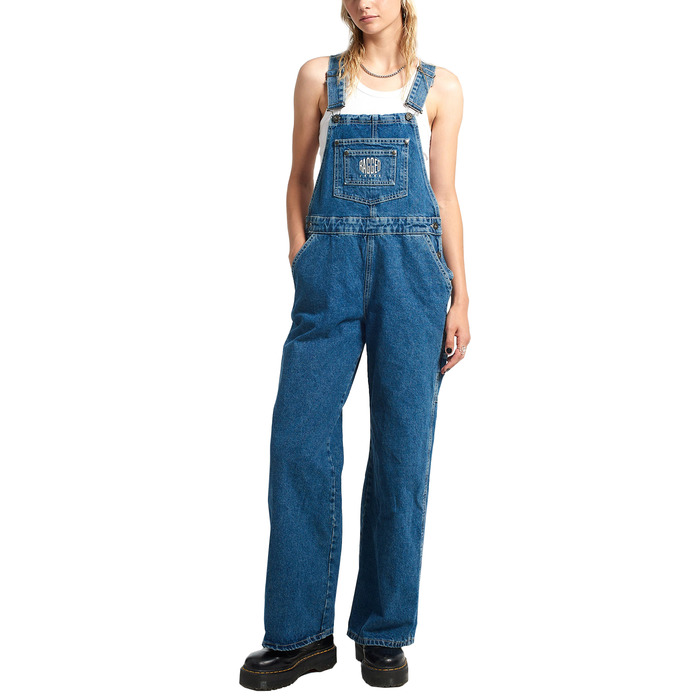 Женский комбинезон свободного кроя с высоким нагрудником и спинкой. У него регулируемые подтяжки, нагрудные карманы, боковые карманы и карманы карго, а также отличительный вышитый брендинг на груди.