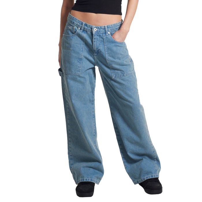 Женские джинсы свободного кроя и с низкой посадкой. Детали: пояс на пуговице и молнии, шлёвки для ремня и нашивка с брендингом на поясе сзади.