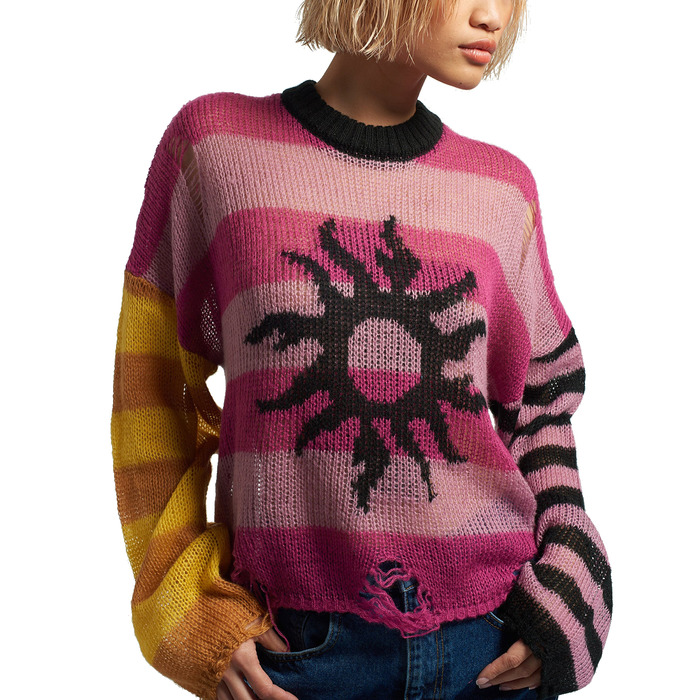 Женский свитер, выполненный в стиле колор-блок. Из особенностей: свободный крой, круглый вырез, заниженная линия плеч и дырки по всему изделию.