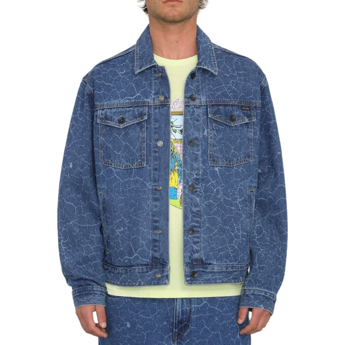 Мужская джинсовая куртка свободного кроя с отложным воротником, которая застёгивается на кнопки. У неё два боковых кармана, два нагрудных кармана с клапанами, регулируемые манжеты и нижний край изделия на кнопках. Состав: 100% хлопок.