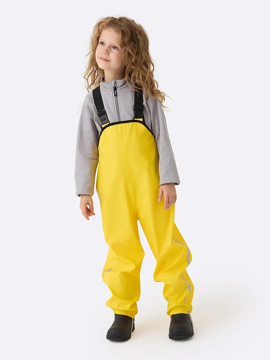 Стильный полукомбинезон сшит из водонепроницаемой ткани — можно смело бегать и прыгать по лужам. Все швы проклеены. Ребёнок останется сухим, даже если захочет скатиться с мокрой горки. Для настоящих непосед предусмотрены съёмные штрипки — они удержат брючины во время активных игр, а ножки ребенка не замерзнут.