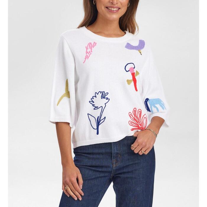 Женский пуловер в свободном крое с укороченными рукавами и мягким прилеганием. Деликатные вышивки на груди и рукавах добавляют изысканности минималистичному силуэту. Изготовлен из натурального хлопка для максимального комфорта в повседневной жизни.