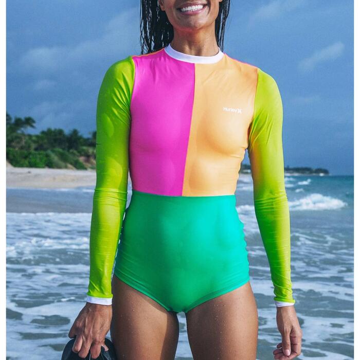 Женский купальник с воротником-стойкой и длинными рукавами выделяется ярким дизайном в стиле колор-блок. Благодаря содержанию спандекса ткань плотно облегает фигуру, повторяя её формы, но остаётся мягкой и приятной на ощупь. Молния сзади обеспечивает удобство надевания, а сочетание переработанного нейлона и стрейча гарантирует экологичность и долговечность.