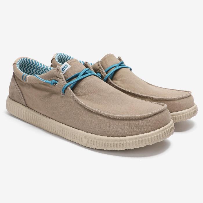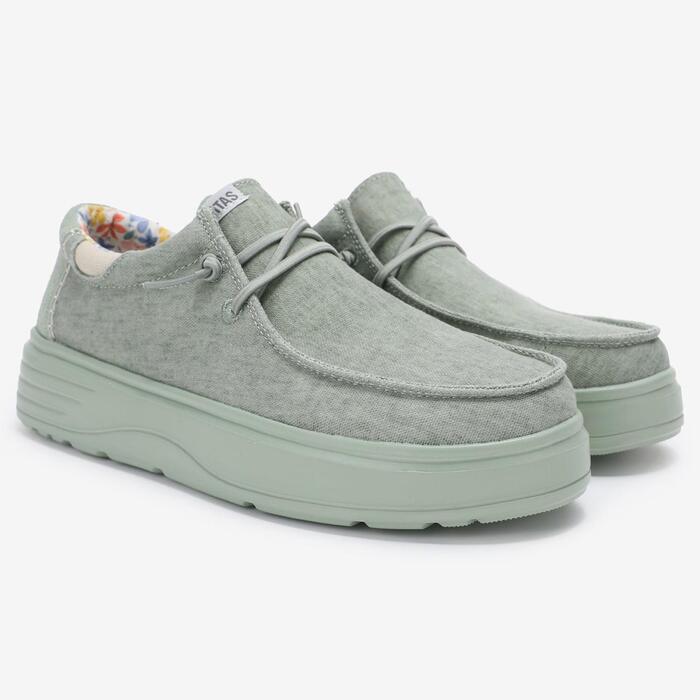 Эта модель воплощает в себе свежесть и лёгкость. Верх выполнен из натуральных материалов — льна и хлопка, дополненного вставками из мягкой замши. Эластичные шнурки позволяют быстро надеть обувь, а съёмная анатомическая стелька из EVA обеспечивает поддержку и комфорт. Лёгкая подошва из того же материала делает шаги мягкими и бесшумными. Эти мокасины подойдут как для города, так и для отдыха на природе — стильно, удобно и экологично.