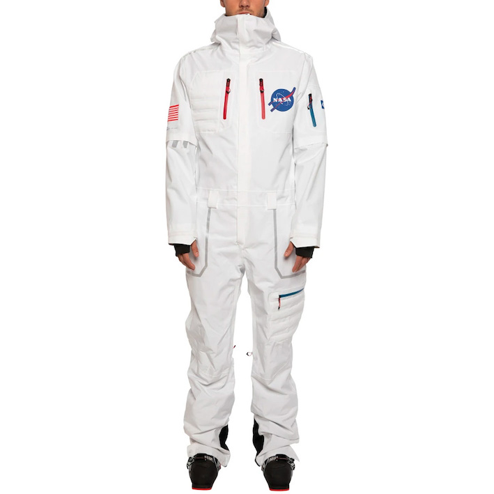 Также в общую коллекцию вошел комбинезон. В нем используется аналогичная мембрана, имеются все необходимые карманы, специальные утяжки, совместимые с технологией BOA, есть вентиляционные молнии как в верхней, так и в нижней части. Перчатки для катания, штаны, лонгслив, шапка и балаклава с характерным графическим дизайном NASA дополняют общий список коллаборации.