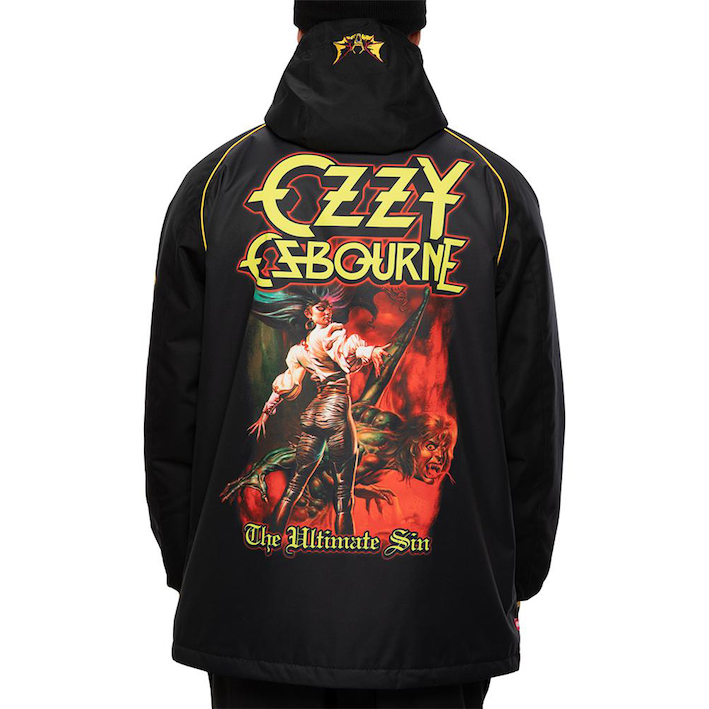 Оззи Осборн и сноубординг — странное сочетание на первый взгляд. Но 686 руководствовался тем, что музыка хэви-метал исполнителя и фронтмена группы Black Sabbath станет саундтреком для многих райдеров. Хедлайнером совместной коллекции стала куртка. Модель сделана по аналогии с туровым мерчем 80-х. Как правило, такие куртки изготавливались из атласа. В варианте 686 есть все атрибуты для катания на сноуборде. В ней используется двухслойная мембрана infiDRY®, синтетический наполнитель InfiLOFT®, отстегивающаяся снегозащитная юбка, система крепления со штанами, есть все необходимые карманы и вентиляционные молнии. На спине расположилась графика с четвертого студийного альбома Осборна “The Ultimate Sin”. Помимо куртки, коллаборацию составили гейтор, шапка, носки и перчатки. “Крестный отец хэви-метала” все одобрил лично.