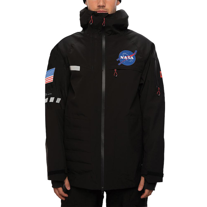 Совместная капсульная коллекция 686 x NASA ( Национальное управление по аэронавтике и исследованию космического пространства). Самым интересным в коллаборации приходится куртка и комбинезон — в моделях применяются все необходимые технологии для катания на сноуборде. В куртке задействована двухслойная мембрана infiDRY®, склеенная с внешним материалом, который обработан водоотталкивающим покрытием DWR. Такая комбинация защищает от влаги и ветра, сохраняя дышащие свойства. Синтетический наполнитель infiLOFT® CLO®, расположенный в необходимых местах (наполнитель состоит на 93% из переработанных материалов), отстегивающаяся снегозащитная юбка, все нужные карманы и вентиляционные молнии — прибавить к этому совместный дизайн и получим функциональную куртку, в которой можно кататься на сноуборде и носить в городе. Модель представлена в двух цветах.