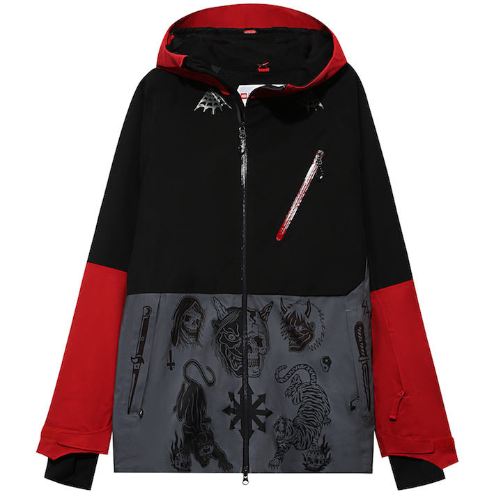 В коллаборации с 686 Sketchy Tank отразил свой стиль на нескольких вещах: носки, анорак с мембраной infiDRY®, перчатки, бандана, два вида балаклав, городская куртка, полукомбинезон и куртка. Последние две позиции наиболее примечательные. Технологичный сноуборд набор в сочетании с графикой Sketchy Tank. Прогрессивность моделей разбавляется работами художника в традиционном “татуировочном стиле”. Подобные интерпретации — попытка преподнести сноубординг в качестве сообщества и некой субкультуры, а не спорта в первую очередь.
