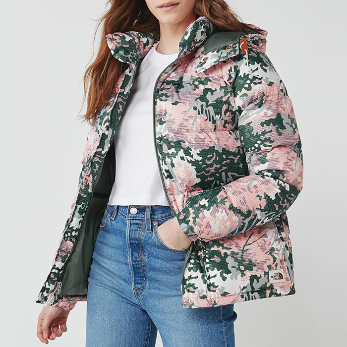 Куртка The North Face Sierra Parka со стилизованным камуфляжным паттерном в пастельных тонах. Главная особенность этой куртки заключается в том, что основная ткань и утеплитель созданы из экологичных материалов. Здесь используется переработанный пуховый утеплитель, плотность набивки которого составляет 600 FP, и технология WindWall®, защищающая от продувания.