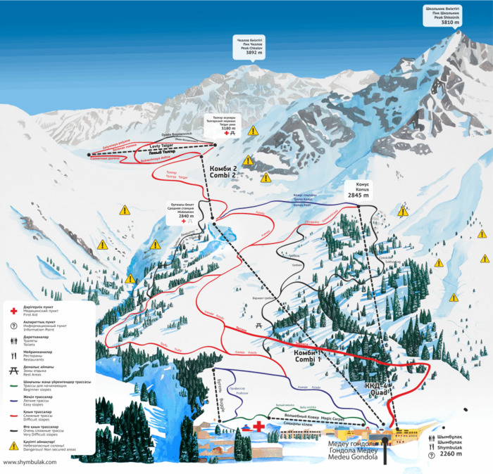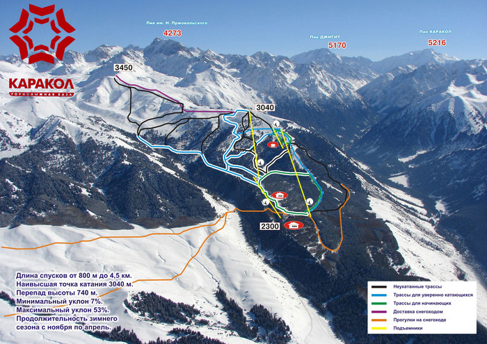 Уникальный по своим природным условиям горнолыжный курорт с базой, расположенной на высоте 2300 метров над уровнем моря, на склонах Тянь-Шаня, среди величественных хвойных лесов. Мягкий климат, обусловленный влиянием незамерзающего высокогорного озера Иссык-Куля, позволит получить максимум удовольствия от катания.