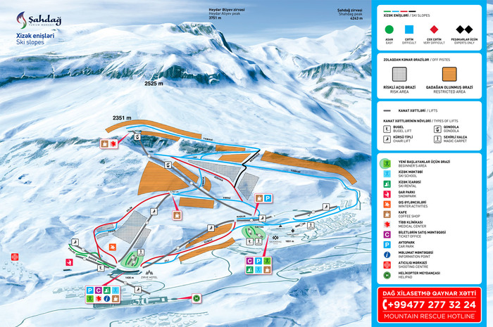 Стоимость: Ski-pass для взрослого на один день стоит 42 маната (2700 рублей), на неделю — 155 манат (10000 рублей). Детский Ski-pass на один день — 28 манат (1800 рублей), на неделю — 134 (8700 рублей).