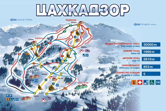 Цахкадзор — самый известный и крупный в Армении горнолыжный курорт, расположенный на живописных склонах горы Тегенис. Верхняя точка катания — 2819 м, откуда открывается потрясающий вид одновременно на гору Арарат и озеро Севан. Для горнолыжников, сноубордистов, любителей беговых лыж и спортивного ориентирования здесь созданы все возможности для занятия любимыми видами спорта. Сезон в Цахкадзоре начинается с середины декабря и длится до конца марта.
