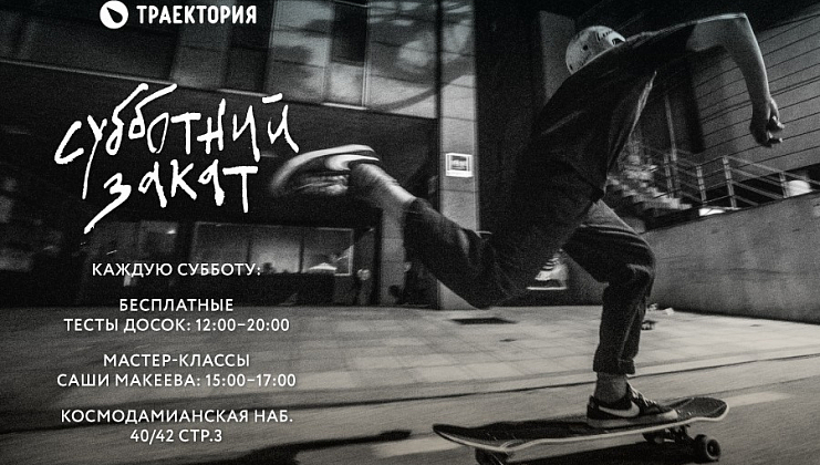 Уже в ближайшую субботу мы начинаем серию мероприятий "Субботний закат" ! Каждую субботу с 12:00 до 20:00 напротив магазина "Траектория на Павелецкой" будет организован бесплатный Тест-Центр с лонгбордами от Carver, Long Island, Yow, Aloki и Sector 9. А с 15:00 до 17:00 будут проходить мастер-классы от Александра Макеева!