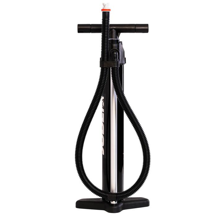 Данный насос для SUP-бордов со встроенным манометром оснащён двумя цилиндрами (ёмкостью 3,5 л каждый) тройного действия. Максимальное давление — 21 psi.