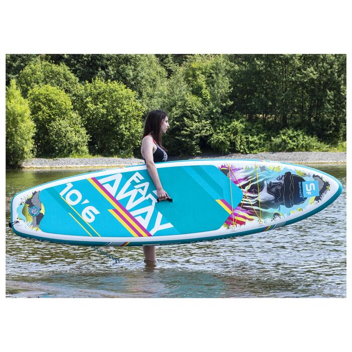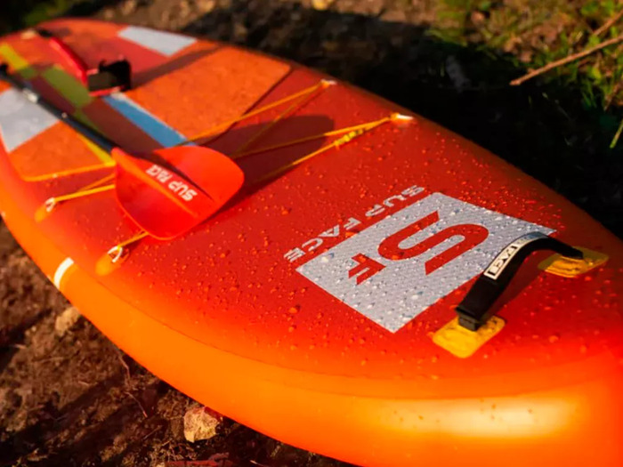 В комплект, помимо доски, входят трёхсекционное весло (карбон + нейлон), ручной насос, сумка для доски на колёсиках, лиш и киль 9″.