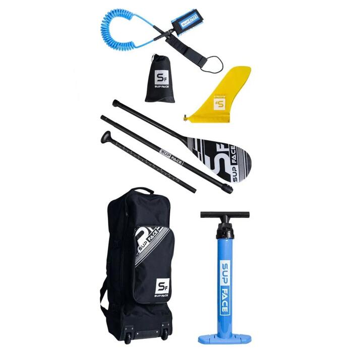 В комплект, помимо доски, входят, трёхсекционное весло (карбон + нейлон), ручной насос, ремкомплект, сумка для доски на колёсиках, лиш и киль 9″.